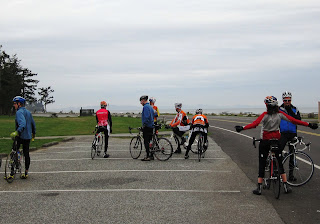 Rode the Donut Ride today for the first time in about a year-and-a-half. (Titanium Clark and Titanium Cancellara rode it too.) Man it was fast, especially the tailwind-aided ride out to Birch Bay which we made in an hour and three minutes. (It's 21.5 miles.) The Donut starts early, 7 a.m., and so by 9:45 you're back in town and you've already got 45 miles in. Nice.